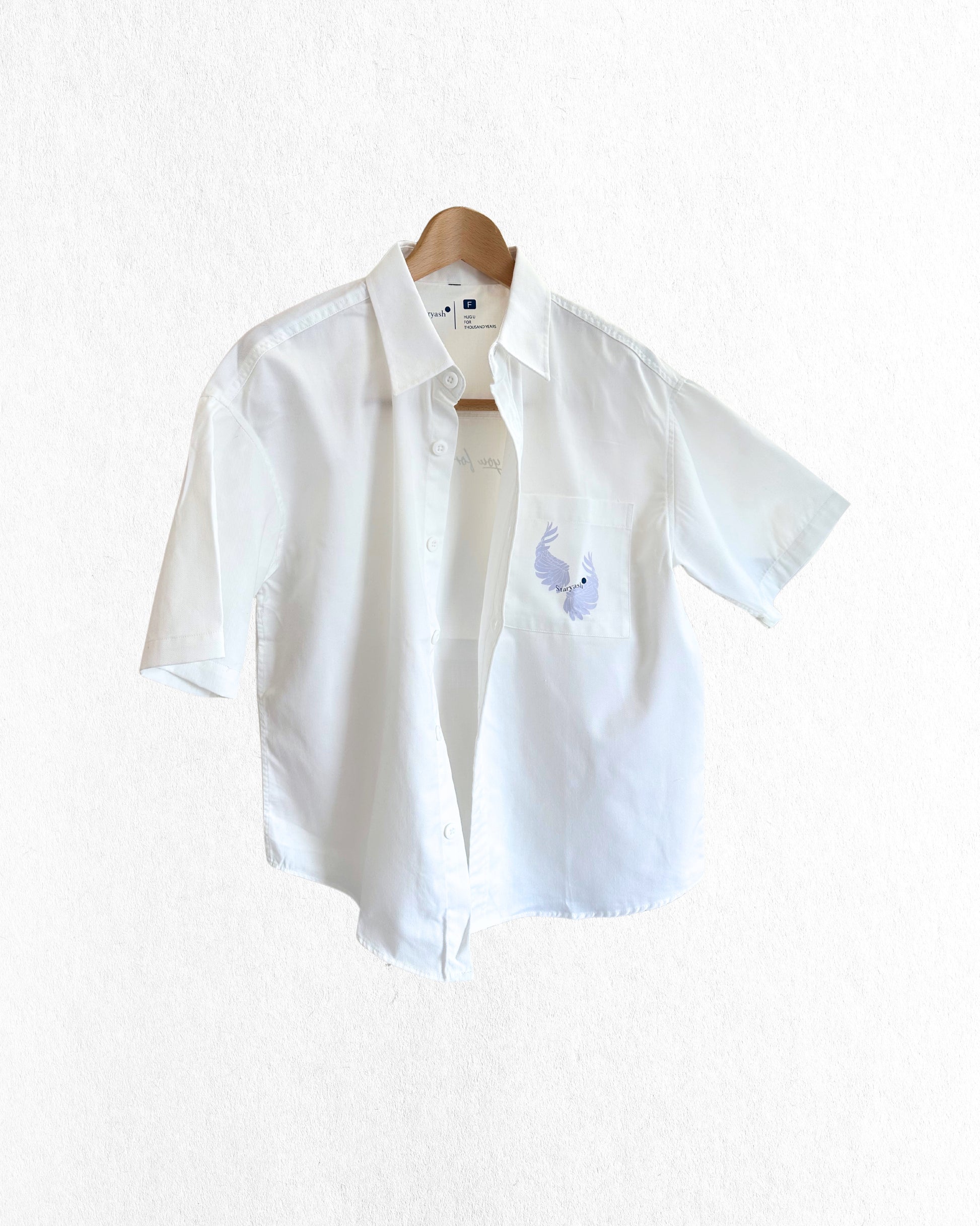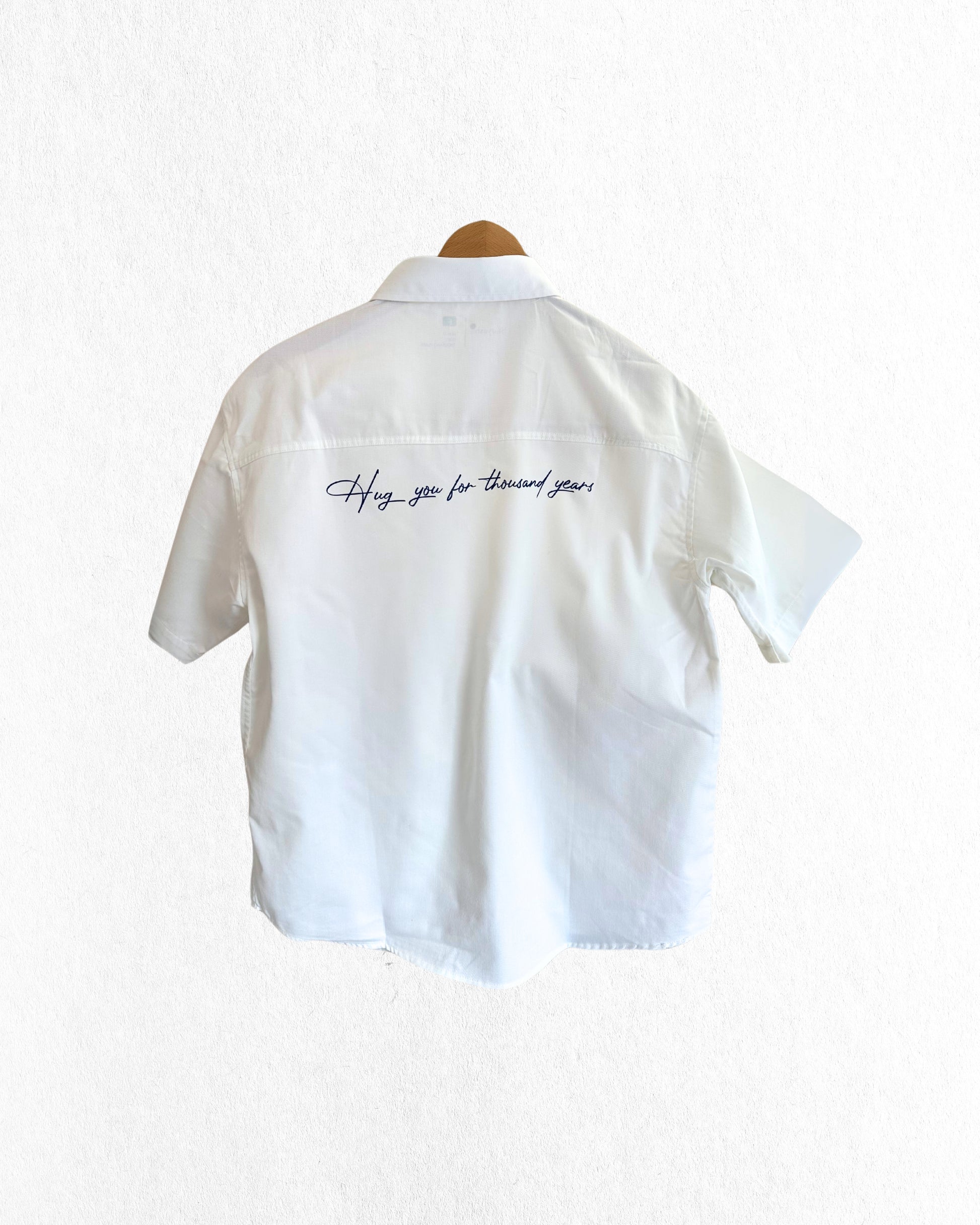 這款衣服的創作完成得非常快,因為看到一個像擁抱形狀的翅膀,就已經立刻敲定它了。然後我思考,我需要做什麼的字呢?內心覺得很徬徨,所以不斷禱告問 神,我突然腦海浮現:「超越千年的擁抱」,我也想起以前讀大學Year one的時候,有天凌晨很努力地禱告,我竟然感受到有翅膀在擁抱我,很溫暖,我那刻想:是天使的翅膀啊。結束禱告後還很努力地在行程本上安排行程,因為想要好好地度過珍貴的時間,趁自己還是比較青春、能熬夜的年紀。完成這個設計的時候,剛好也是坐在大學時期經常去的地方附近,坐在公園里定好稿,公園的暖黃街燈,映照著這行英文字,讓我的回憶穿梭時空,交錯又重疊,彷彿回到了最美好的青春時光,超越了時空的限制。